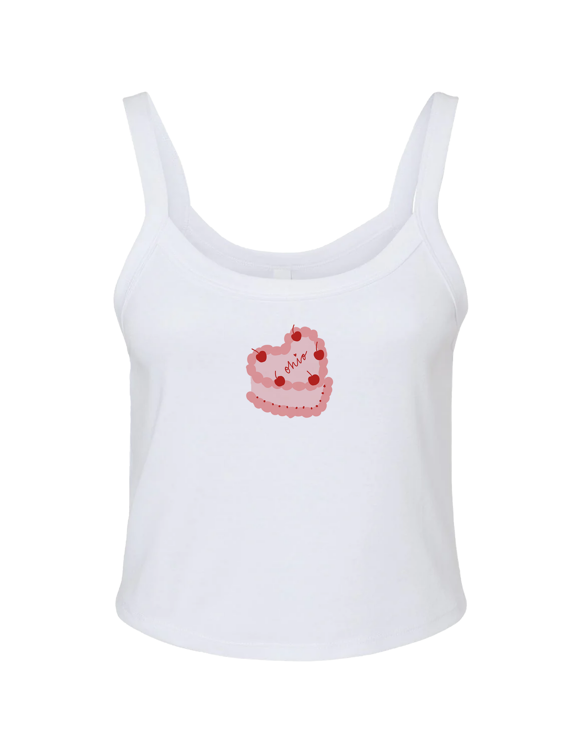 White basic scoop-neck tank top with pink cake graphic on the chest.