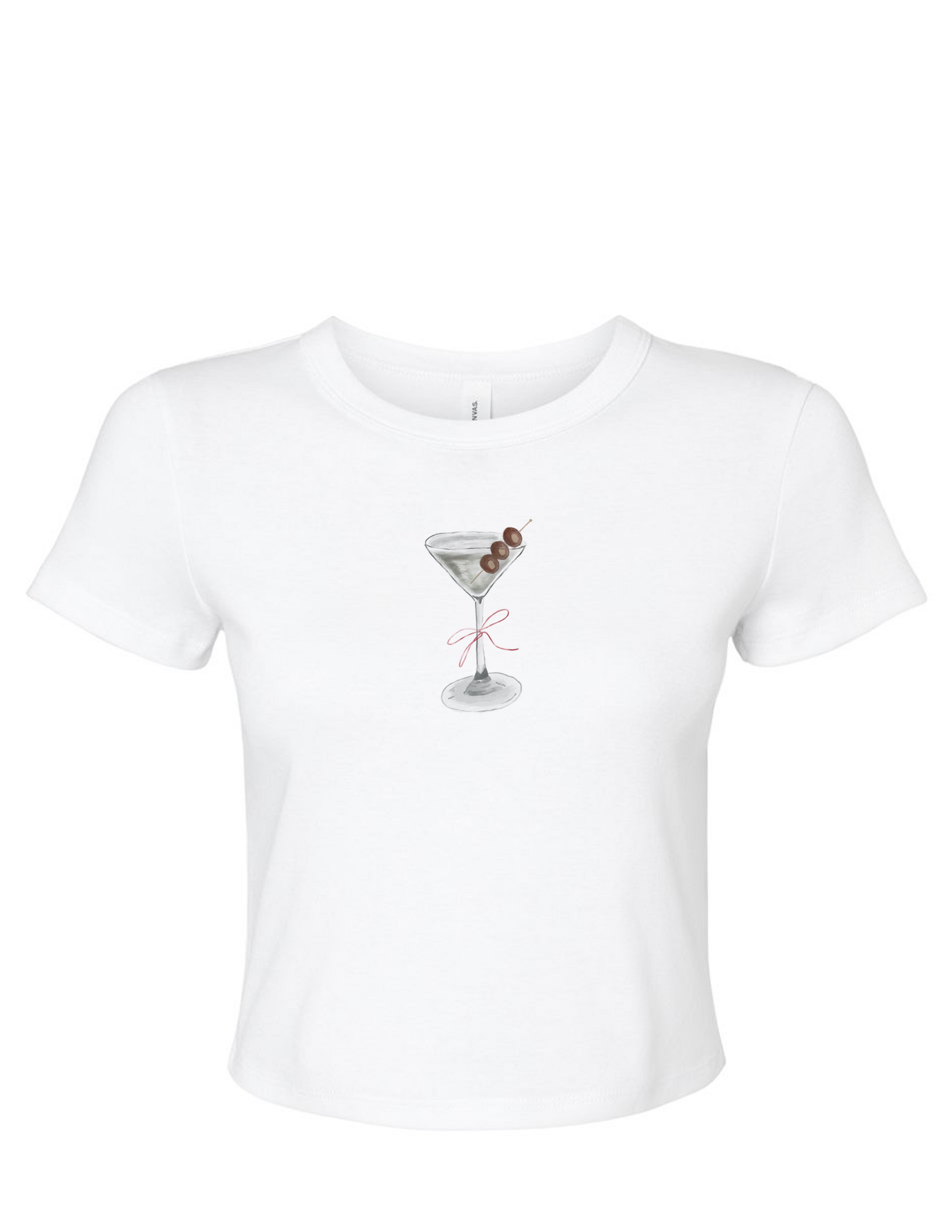 White fitted baby tee with martini graphic on the chest.