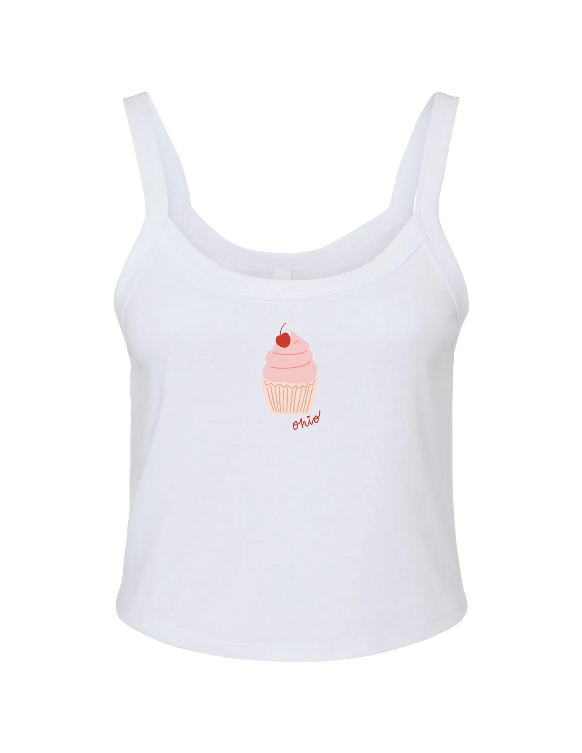 White basic scoop-neck tank top with cupcake graphic on the chest and cursive Ohio font.