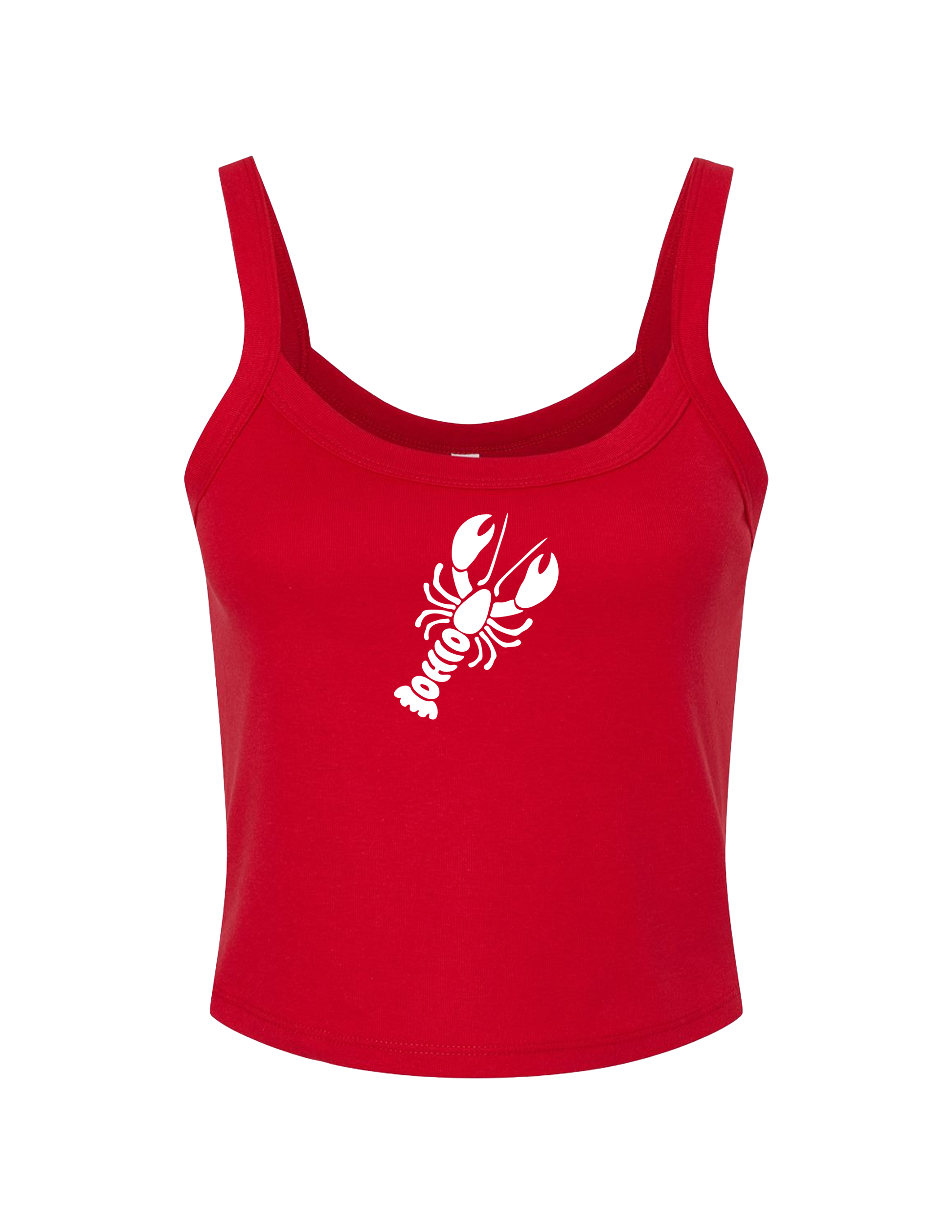 Basic white scoop-neck tank top with lobster graphic on the chest.